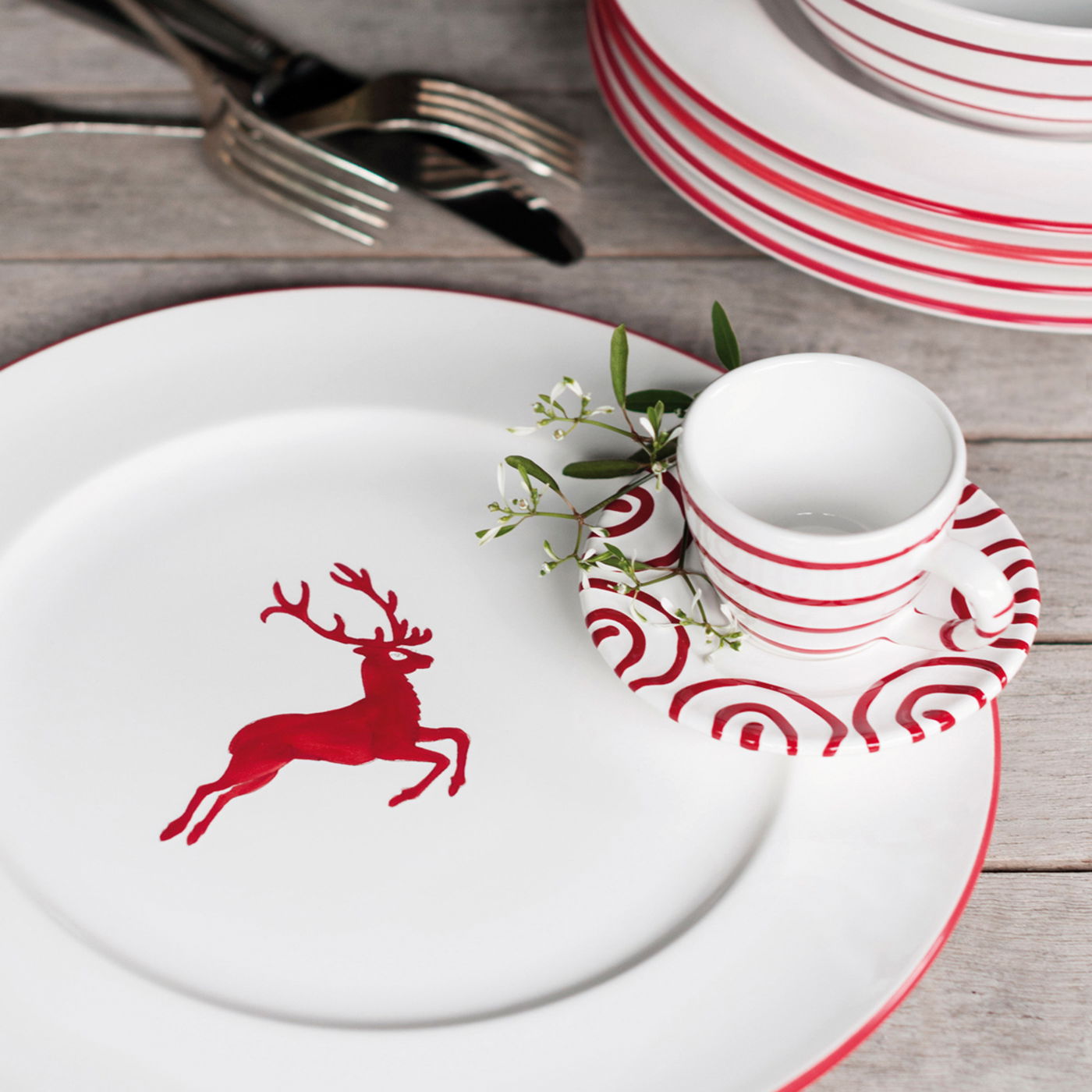Knalliges Rot trifft strahlendes Weiß: Wer es gerne farbenfroh mag, wird dieses Design lieben. Und ganz nebenbei lässt es auch noch das Herz eines jeden Österreichs höher schlagen. Jedes Stück wird von Hand gefertigt und ist ein echtes Unikat. Gmundner Keramik eignet sich zudem für die Spülmaschine und Mikrowelle.